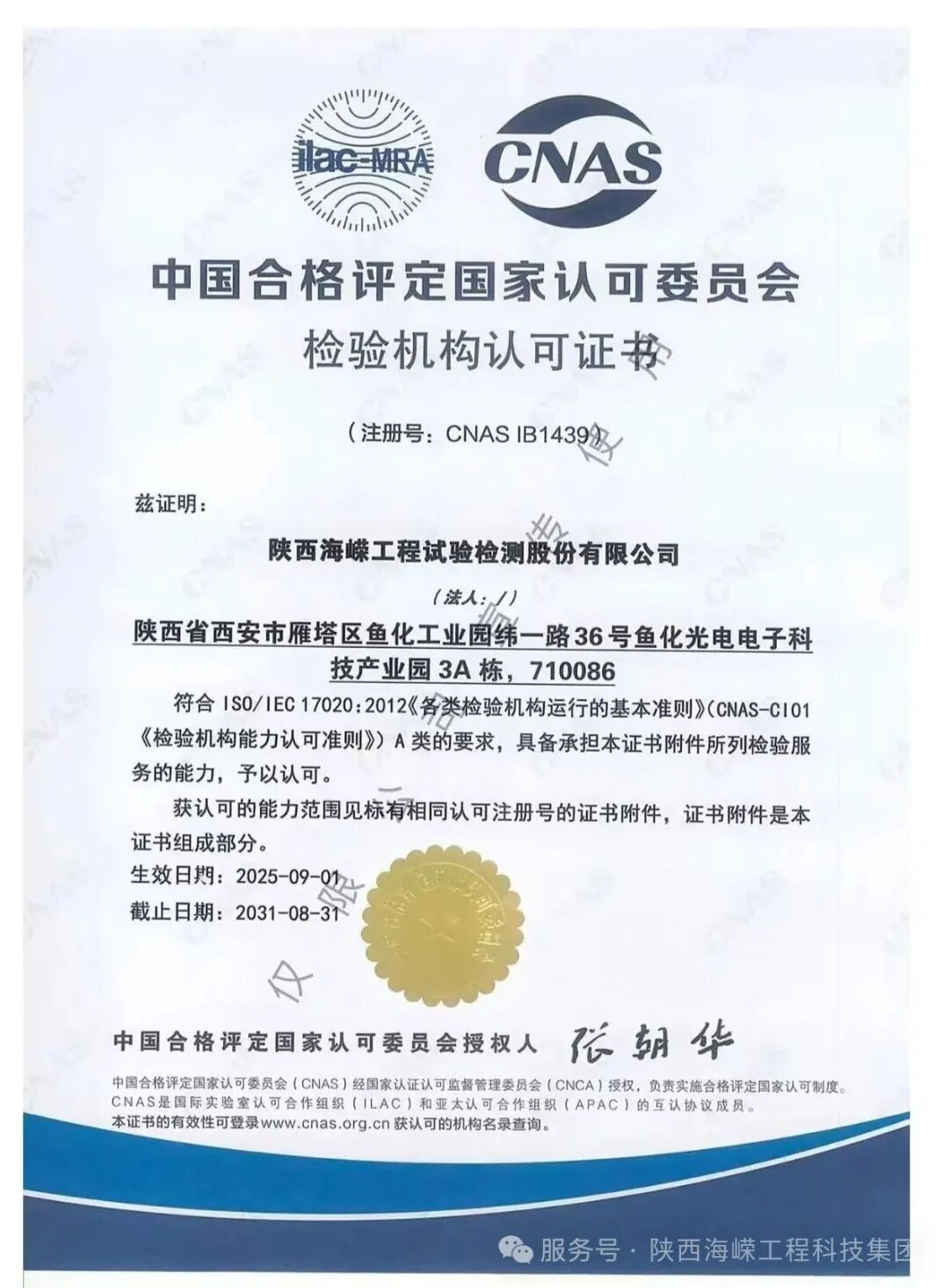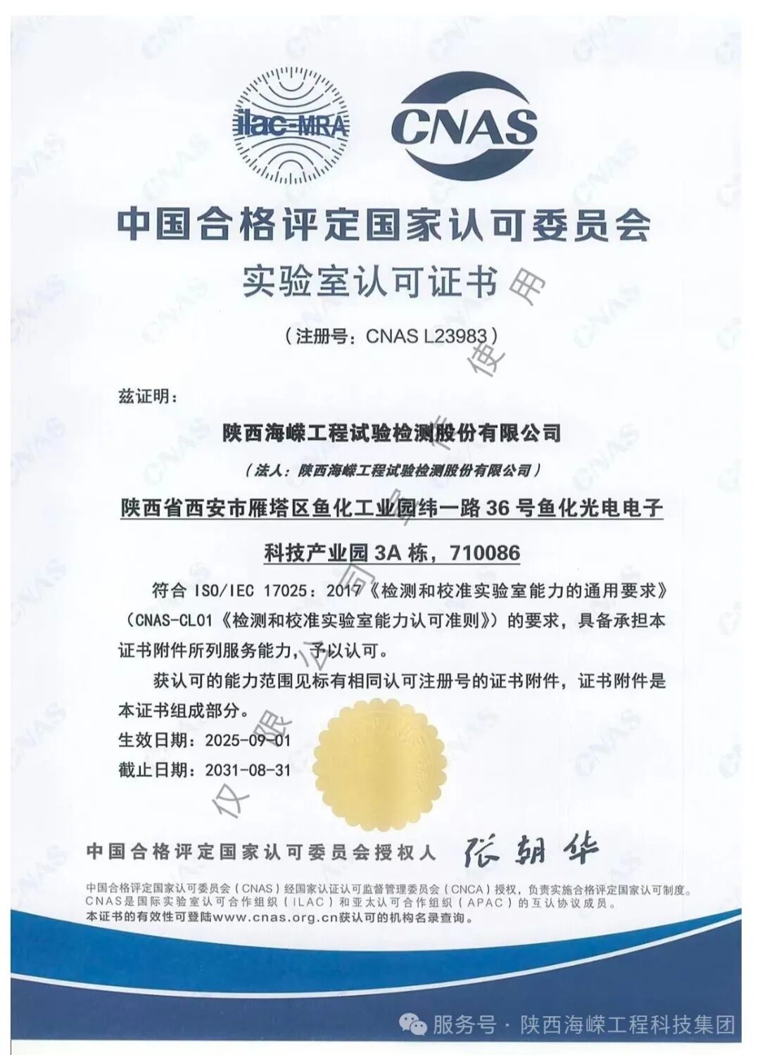 陕西海嵘工程试验检测股份有限公司所取得的 CNAS 实验室及检验机构认可证书,具有重要的行业示范意义。其中,实验室认可严格遵循 ISO/IEC 17025:2017《检测和校准实验室能力的通用要求》(对应 CNAS-CL01《检测和校准实验室能力认可准则》),公司由此具备对土、骨料、掺合料、无机结合料稳定材料、混凝土与砂浆类材料、沥青及沥青混合料、土工合成材料、防水材料及防水密封加固材料、管材、支座、桥梁伸缩装置、涂料产品、检查井盖和雨水篦、砖瓦砌块及石材、金属材料及其制品、交通安全设施,以及地基基础、主体结构、道路工程、桥梁工程(钢结构无损检测项目除外)、隧道工程、钢结构工程(钢结构无损检测项目除外)、地下工程、工程测量与监测等对象的专业检测服务能力。